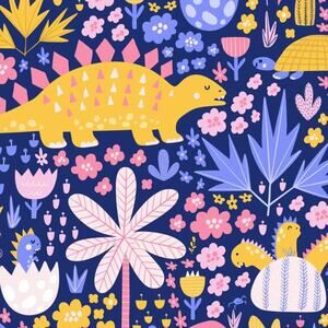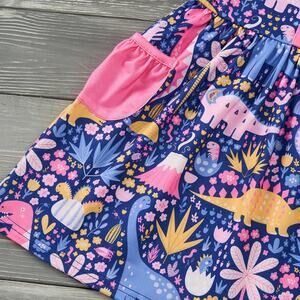 The Darling Dinos dress features a bright dinosaur and floral pattern with short flutter sleeves.