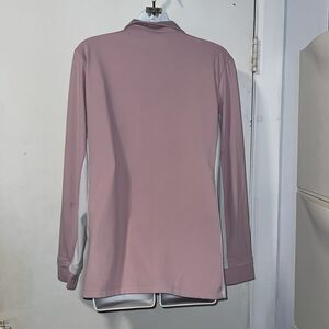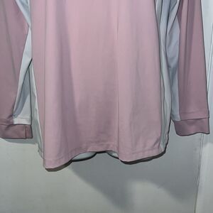 Light pink tech material —feels like polyester and spandex—with milky white paneling detail on the sleeve and side body, bright pink logo on left chest, collar and button up closure, cuffs with slits for a room and comfort. Excellent condition. Machine wash cold and air dry. Size large, measures 20” from