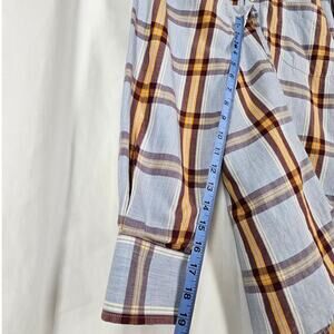 Color: Blue, brown, and white plaid