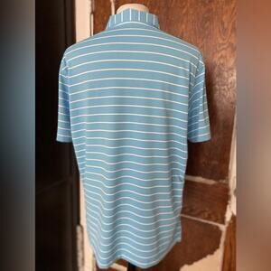 This PETER MILLAR polo shirt in size Large features a stylish striped design in a light blue color. It is made of a comfortable and lightweight blend of polyester and spandex, making it perfect for the spring and summer. Also featuring a collared neckline, 3-button placket and an embroidered logo on left chest. It is suitable for both activewear and casual occasions, and is ideal for golfing with its performance/activity focus. This polo would make a great addition to any wardrobe.