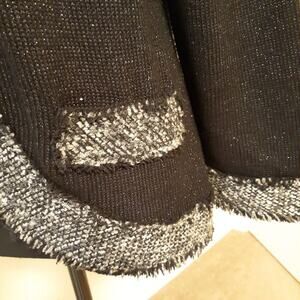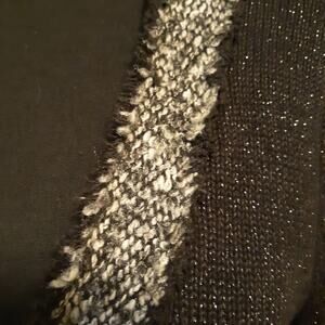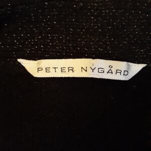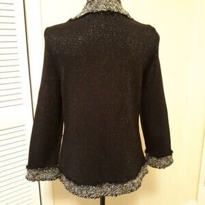 This Peter Nygard blazer jacket is designed for women in a size small, featuring a black color with gray trim and a knit fabric type. The jacket has a short length, 3/4 sleeves, and is accented with fringed trim for a stylish touch. Perfect for various occasions including travel, parties, formal events, or business settings, this classic-fit blazer offers a lightweight and breathable feel, making it ideal for layering during the fall, winter, or spring seasons. The jacket is recommended for dry clean only and exudes a designer, art, and bohemian theme.