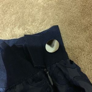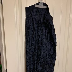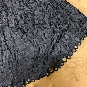 DEEP NAVY CUT OUT PATTERNED NAVY MIDI FLARE SKIRT. CIRCLES MAKE STUNNING PATTERN; FULL BODIED LOOK.