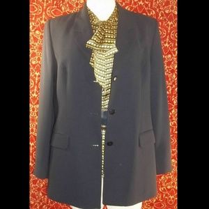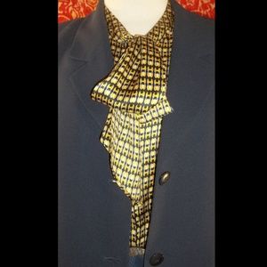 Excellent Vintage Condition - looks barely worn: It does not have shoulder pads, has some gathering on the shoulder. Fabric is a soft, satin silk with sheen. Button front with single button cuffs. Ties at neck. Does not include belt or jacket.