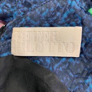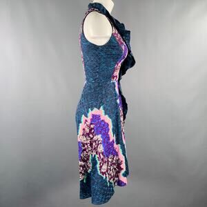 PETER PILOTTO dress in a blue and multi-color fabric featuring a floral design, sleeveless style, ruffle front with optional zipper for a deeper neckline, and back zipper closure.