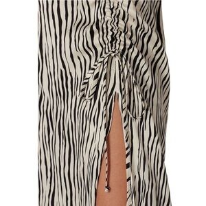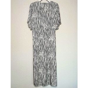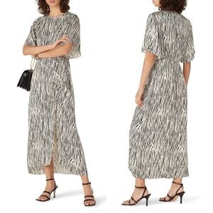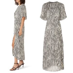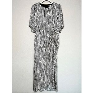 PETERSYN 70s Wide Flutter Short Sleeve Ruched Tie Slit Zebra Satin Midi Dress L