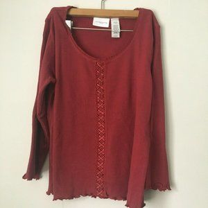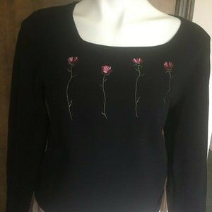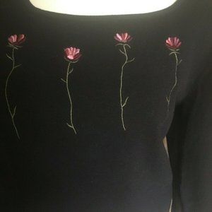Both are Petite Mediums tops. Black top is a thickish fabric. Excellent condition. Very pretty embroidered flowers.