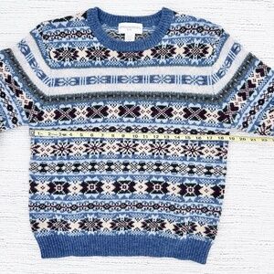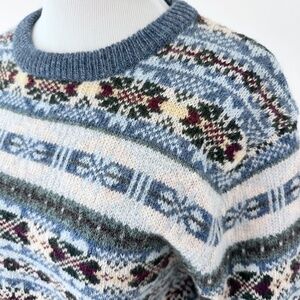 Beautifully made 100% Shetland Wool crewneck sweater with an allover fair isle design.