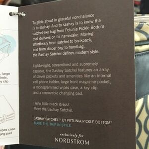 Petunia Pickle Bottom Sashay Satchel. Includes baby-changing pad and plastic wipes case. Can be worn over the shoulder or as a backpack. Great neutral colors. Dimensions are approximately 13.25”W x 15”H x 5.5” D. New with tags. MSRP $180.
