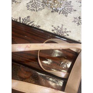 Color transfer or discoloration on the light brown handles/trim. General leather wear. Zipper inside functional. Overall great quality leather bag.