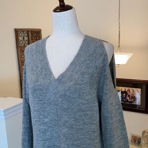 NEW! Heather grey, single cold shoulder style, very soft light-weight sweater. Deep V-neckline both from and back back. 75% Acrylic, 22% Polyester, 3% Spandex, material blend adds stretch and comfort. Approx. 22" armpit to armpit, 25" shoulder to hem, and 24" sleeve.