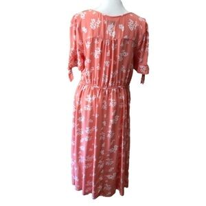 Peyton & Parker midi length button front shirtwaist dress. Cream colored flowers and light tan polka dots on soft peach background. Elastic waist back. Short sleeves tie at cuffs. Very good pre-owned condition with only signs of normal wear and maintenance. Size M