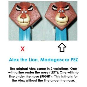 Alex the Lion PEZ from the DreamWorks, Madagascar Collection. Alex is the self-proclaimed king of the NYC Central Park Zoo from the original Madagascar movie. Fun Fact, the collection was released with 2 variations of Alex. One with No Line from the nose the mouth, one with a line. This listing does NOT have the line. As can be expected from PEZ, the dispenser stands out with a vibrant blue stem and a sculpted detailed head.