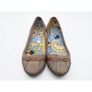 PF Flyers Pumps Womens 8 Low Wedge Brown Fabric Uppers Quill Leather Slip On