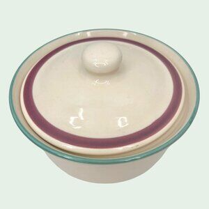 Nice Pfaltzgraff Juniper casserole or butter dish with lid! Green and mauve lines on the ivory color dish, mauve on the lid. Dish measures 5.5" in diameter. Holds 2 cups/16 oz of liquid. No chips or cracks. Has slightly darker marks along bottom rim and small area of lid rim as pictured. Great piece!
