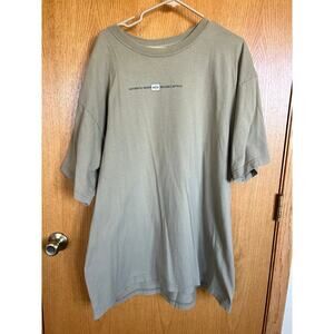 Men's 2XL tan crewneck short sleeve T-shirt. Made of cotton. Armpit to armpit is 27", length is 32". Front has AUTHENTIC GOODS RELIABLE ARTICLE across chest.