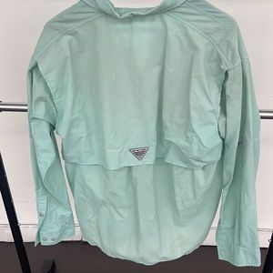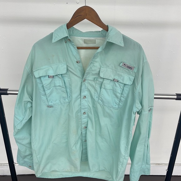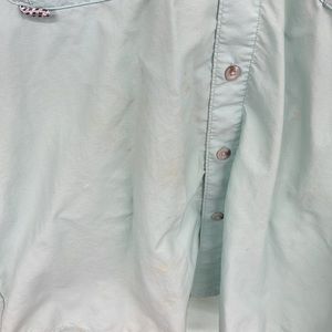 This shirt has a few stains but has a lot of life left! Buttons are all in great condition!! Very light & airy.