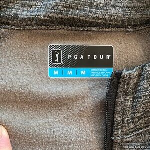 PGA Golf Tour new with tags, long sleeve pullover, outerwear shirt or jacket. It has a quarter zip in the front and the colors are primarily gray and black at the wrists. It does have the kangaroo pocket. The measurements are in the pictures and thank you for considering my item.🏌️♂️