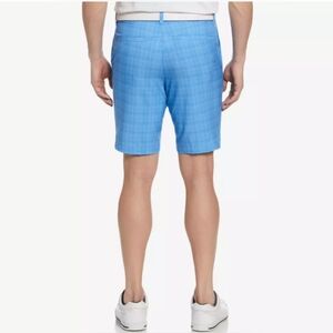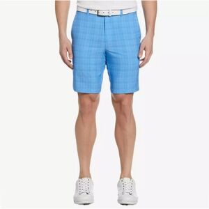 PGA TOUR Mens 9" Flat Front Vacation Plaid Short Zip fly with button closure Durable plain weave fabrication Flat front for a clean contemporary look Sun protection helps to block damaging UV rays Moisture wicking helps keep you feeling dry 4-Way stretch for a full range of motion Active waistband for a flexible fit 9" Inseam Plaid pattern adds eye-catching style Two hand pockets at sides; two pockets at back Inseam : 9" Leg opening : 24" Size : 38 Color : Nautical Blue #Lot9