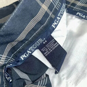 PGA Tour Golf Shorts. Men's Size 44. 9" inseam. Navy Blue Plaid Quick Dry Athletic Flat Front.
