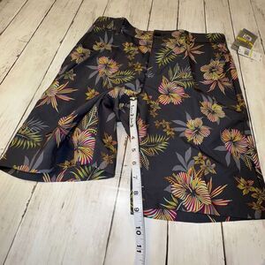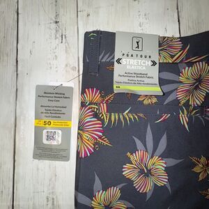 These PGA Tour Men's Performance Active Waistband Golf Shorts in a size 30 are designed for comfort and functionality during golf or other active wear. The shorts feature a stylish gray color with a floral pattern, a button closure, and a flat front design. Made of a blend of polyester and spandex, they offer stretch, moisture-wicking properties, and UPF 50 sun protection. With slash pockets for convenience and an easy-care, machine-washable design, these shorts are ideal for golfing in the summer, fall, or spring seasons.