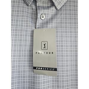 The product is a men's XXL polo shirt by PGA Tour, featuring a classic fit with a collared neckline and short sleeves. This grey plaid shirt is made of 100% polyester material, designed for moisture-wicking and UPF 50 performance. It is suitable for activewear, casual wear, and business occasions, with machine washable care instructions. The shirt also includes stretch material, stretch shoulder seams, and easy-care features, making it an ideal choice for golf activities during the summer, fall, and spring seasons.