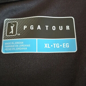 This PGA Tour pullover polo shirt in men's size XL features a striking black base with an abstract gray and white design across the front.