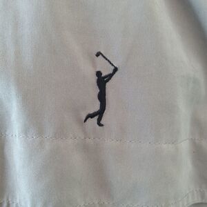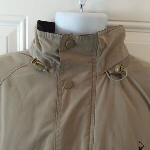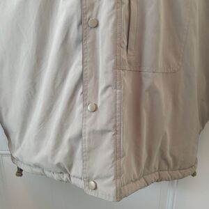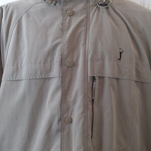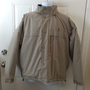 PGA Tour Originals khaki fleece-lined padded zip and snap front jacket with three outside pockets, two inside pockets, hidden Hood, toggled neck, and hem.