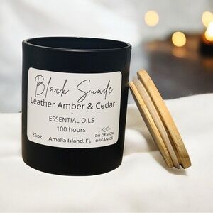 Introducing our 24oz exquisite organic candle, "Black Suede." Immerse yourself in the allure of this luxurious scent, carefully crafted to transport you to a world of sophistication and elegance.