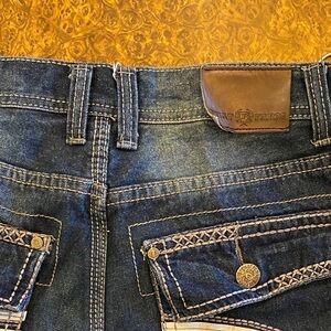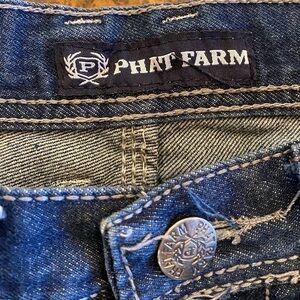 PHAT FARM 32 x 32 Embroidered Blue Preowned Skinny Jeans Denim. The back logo patch has detached on lower left corner. The jeans have a nice crease which gives them an elevated look. Nice jeans. Waist measures approx 32” wide. Inseam measures approx 32” long. - Tag inside says 32x34.