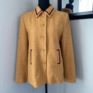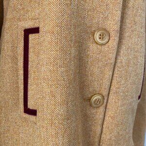 Color: Orangish/camel with burgundy velvet trimmed pockets/collar