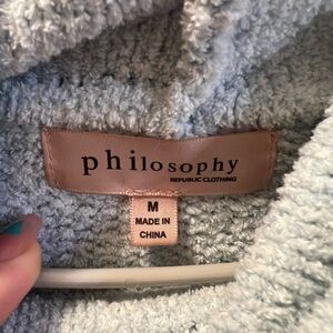 Women’s Philosophy sweater size medium. Small stain as pictured. This sweater is light blue