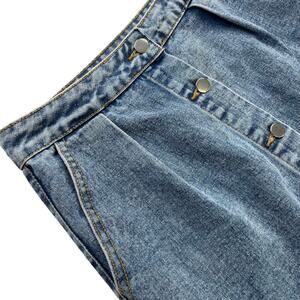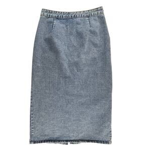 A medium/light wash denim midi/maxi 90s skirt with button closure and pockets, size small. Actually the brand and size tag have been removed, but will likely best fit small, check measurements to be sure. Has an area of discoloration on the front, check last photo.