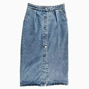 PHOEBE | Vintage S Medium Wash Button Down Denim Midi Maxi Winter Skirt Pockets