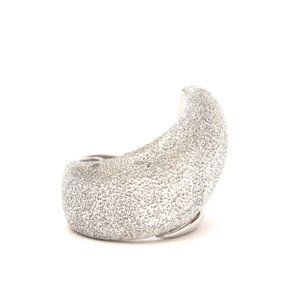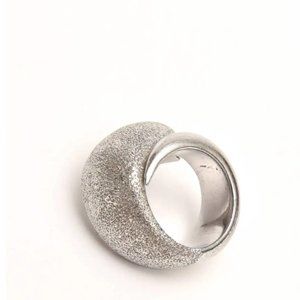 This Italian dome like ring is the combination of brushed sterling silver and polished sterling silver. This sculptural ring is from the house of Pianegonda. The brushed sterling looks like white gold and the finish of the ring sparkles like pavé stones. The width of the band in the back is thicker than most as shown in the photos. Elegant and forever. Substantial ring in look and weight. It's modern, it's artsy, and it makes you take a second look.