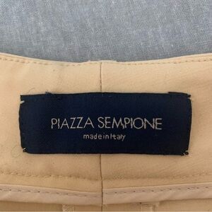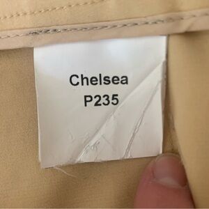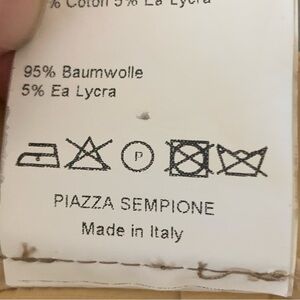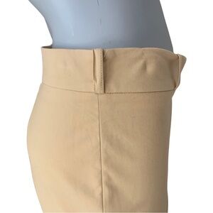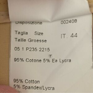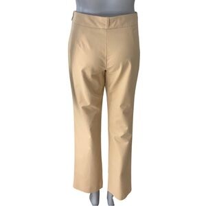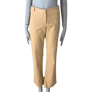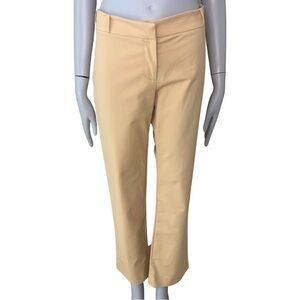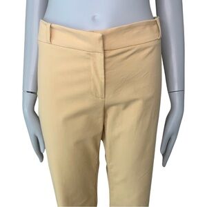 Italian Size 44 = US 8. Made in Italy. Excellent condition. A lovely goldish yellow color. Style name is “Chelsea”. Tailored pant. Good amount of stretch: 95% Cotton, 5% Spandex/Lycra. Mid-rise. Zip front with hook & bar closure. No pockets. Shown modeled on a size 0 mannequin with extra fabric cinched in back so fit may differ. Approximate measurements (taken when laying flat and not stretched):