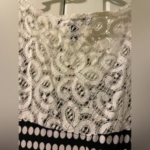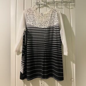 EUC-worn maybe once and has a small spot on arm that is hard to see and not sure if it will come out (last picture). Size large black/white abstract top with 3/4 white mesh and see through sleeves and lace details on upper back. Armpit to armpit 21 1/2” and centerback length is 28”. Tote 17.