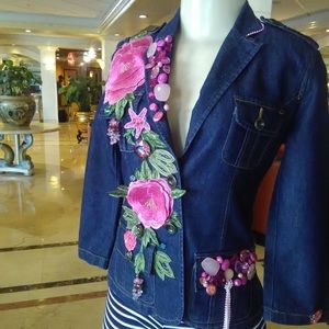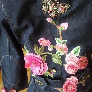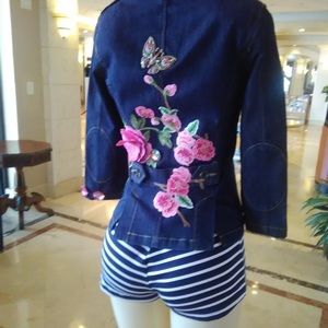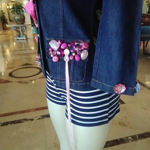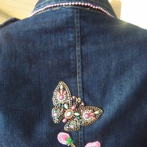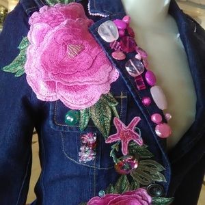 So gorgeous, sexy and young. This 22" long jacket is pickled pink with pink roses and pink transparent beads just to kick it up a notch. Multicolor metallic butterfly sits in the upper back. Strings of pearl finishes collar while pink ribbon and pearls hangs from left pocket flap. Front button closure. Functional breast pockets. DRY CLEAN ONLY