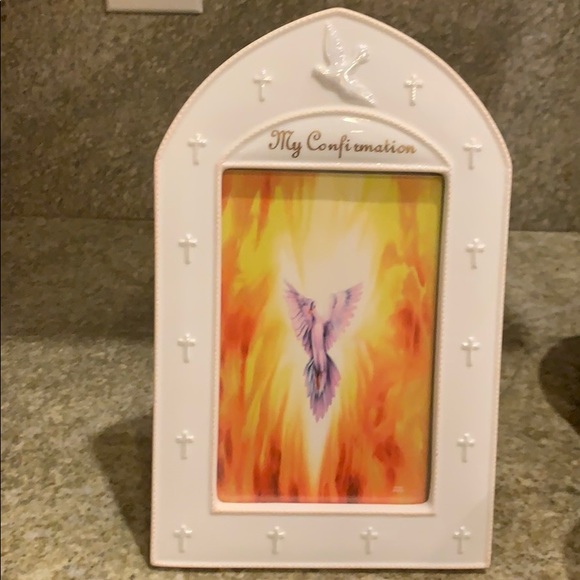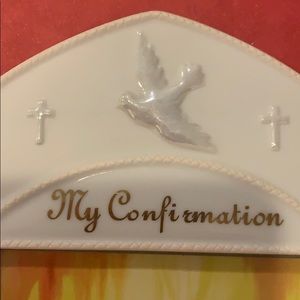 New My Confirmation frame. The frame has crosses in a pearlized coating along with the penalized dove at the top. My Confirmation is in gold letters. It measures 9.5” in length and 6” in width.