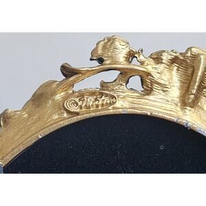 Gorgeous vintage Matson F1782 jeweled oval picture frame from the Peti Cadeau Collection. This rare Hollywood Regency–style frame features 24K gold-plated ormolu metal, raised rose vines, and sparkling rhinestones that catch the light beautifully. Marked Matson F1782 on the back. The frame is about 5" high and is a tabletop display. The class covered opening is about 4"x3" for picture.