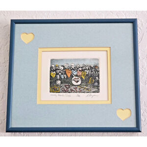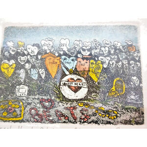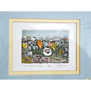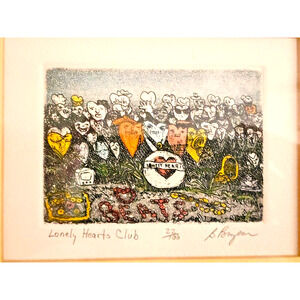 Unique art print by artist Bill Bryson. This is a 4" x 2.75" print that sits on a white matting that has a small yellow matting with a light blue matting over that. It is signed by the artist, titled by the artist, and is numbered 22/100. The blue matting has two heart cutouts that show the yellow matting underneath to give this picture a unique matting feature. It has a blue metal frame that measures 10" wide and 8.5" tall. It can be hung from a nail that will fit under the frame on the back. There is no wire for hanging. The picture is an artist's take on the Beatles' Sgt. Peppers Lonely Hearts Club Band album. It is a unique picture and framing. *Note-some of the photos show the matting has a cream color. It is white, yellow and blue layered matting.