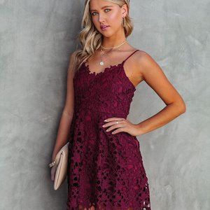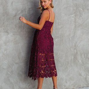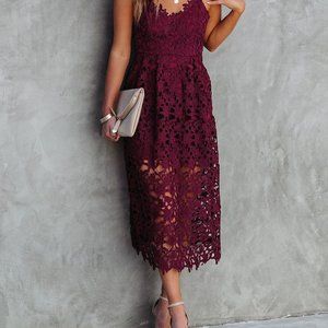 //Best Seller// New Color// Our Picturesque Pocketed Crochet Midi Dress is as pretty as can be! Crafted from a burgundy lace overlay with white lining. Cut with a v-neckline and adjustable spaghetti straps, while the flared skirt is complete with two functional side pockets. Finished with a concealed back zipper closure. Styled with the Roxy Hoops, Chloe Mini Necklace, Compass Coin Necklace, Elena Tennis Necklace, Simple Bangle Bracelet, Stella Crossbody Envelope Zip Clutch, and Ritz Faux Suede Pointed Heel.