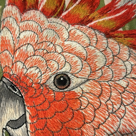 PIER 1 Coral Pink (The salmon-crested cockatoo, also known as the Moluccan cockatoo ) Moluccan Cockatoo Embroidered Tropical Palm Leaf Indoor Outdoor Pillow 18” X 18”. Excellent condition. Was only used to take pictures for stage a house listing . I have 2 for sale. Indoor outdoor water repellent fabric . Braided jute trim . 18” X 18” . I have 2 of these exact pillows.