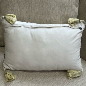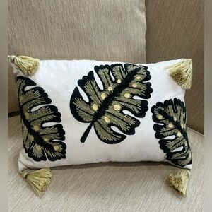 Decorative throw pillow with leaf embroidery. Features tassels on corners. Perfect for adding a TROPICAL TOUCH TO HOME DECOR. PRE OWNED IN EXCELLENT CONDITION.