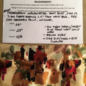 PIERRE CARDIN 100% Polyester SILKY SKIRT, 3-Pleated, Red/Gold/Olive/Orange/Black ABSTRACT print, NWOT; Women’s Size 12.