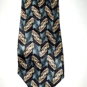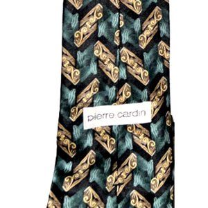 This is a Vintage 90's Pierre Cardin Men's Necktie in an Abstract Art Deco Type Pattern in Black, Golds, Dark Teal with Light Silver. Unusual Design w/ Very Striking Colors. This is a general length tie (57-60 Inches) and Width is 3.5 Inches Wide.The Tie is made of 100% Silk. Made in the USA of Imported Materials.