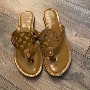 PIERRE DUMAS WOMEN'S LIMIT-20 MEDALLION FLIP FL0P SANDALS MOCHA SIZE 7.5 IN GOOD CONDITION OTHER THAN THE LEFT FOOT TOP OF TOE HAS A BIG SCUFF.