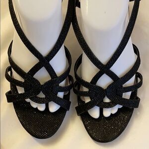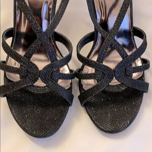 PIERRE DUMAS SHIMMERY BLACK STRAPPY HEELS. THE SHIMMER ON THESE IS NOT OVERBEARING. THESE ARE DELICATE, ELEGANT. THE PADING ON THESE MAKE THESE HEELS VERY COMFORTABLE. 4.5 INCH HEELS. NEW