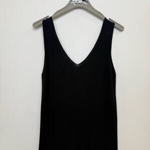 Sleeveless. V-neck. Pull-on closure. 49" from shoulder to hemline. Pit to pit 17. Waist 30. Fabric is stretchy