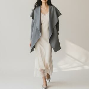 Keywords: Piko Wool Cardigan, Waterfall Coat, Open Front Jacket, Gray Wool Blend, Cozy Layering Piece, Minimalist Outerwear, Modern Casual, Women’s Small