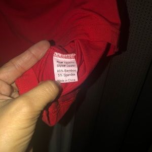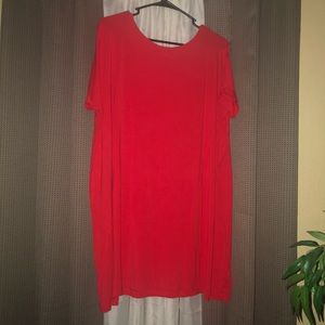Almost red but has a bright pink to it. Super comfortable and can wear just for comfort at home. I never did. Worn once. It’s a medium but a large can wear. Can wear as off the shoulder. There no stains or rips.